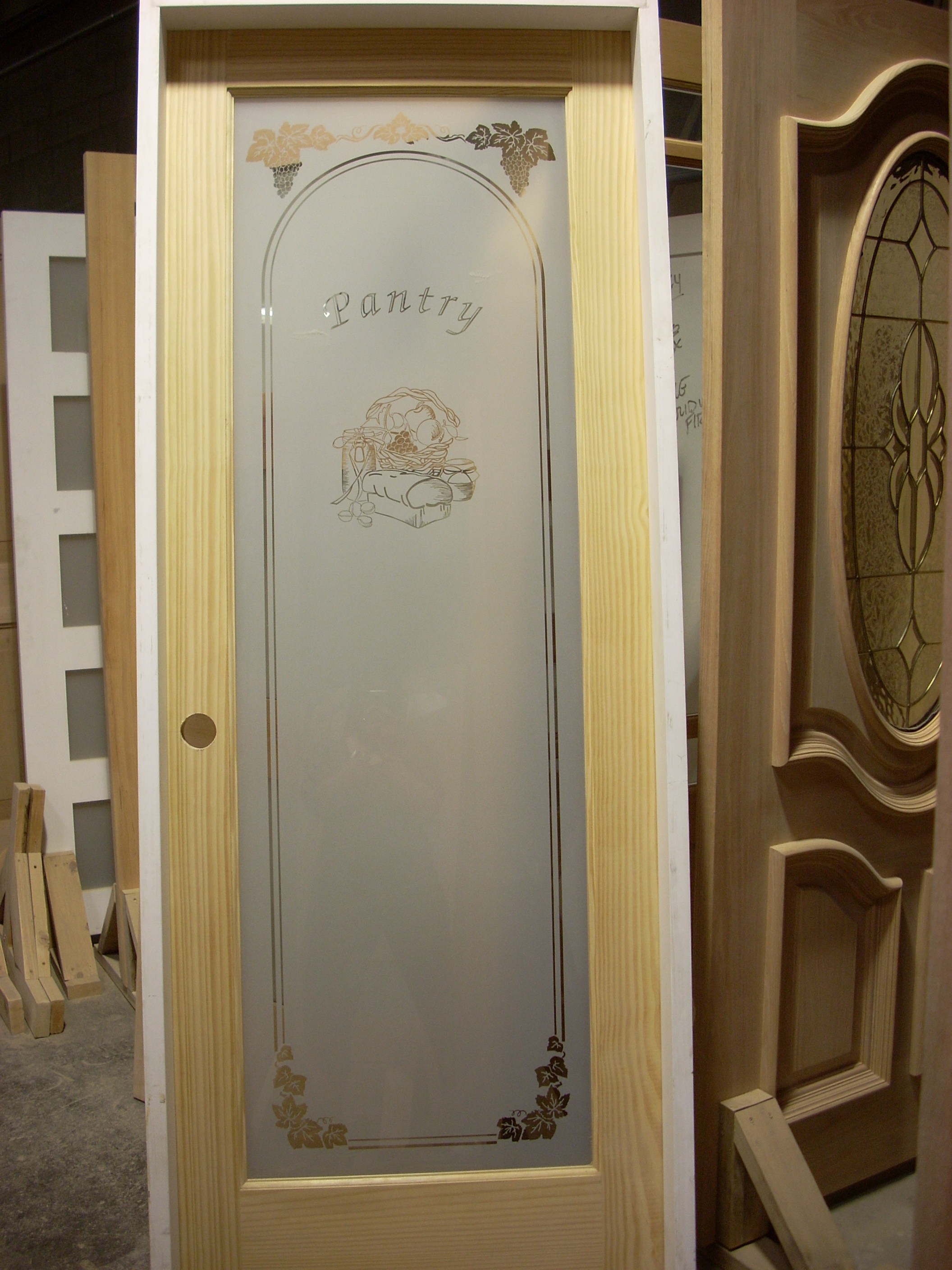 The default for interior doors is clear glass and exterior doors is low-E argon clear glass. Options include white lami, rain, granite and virtually any other type of art glass, and any combination of true divided lite bars..